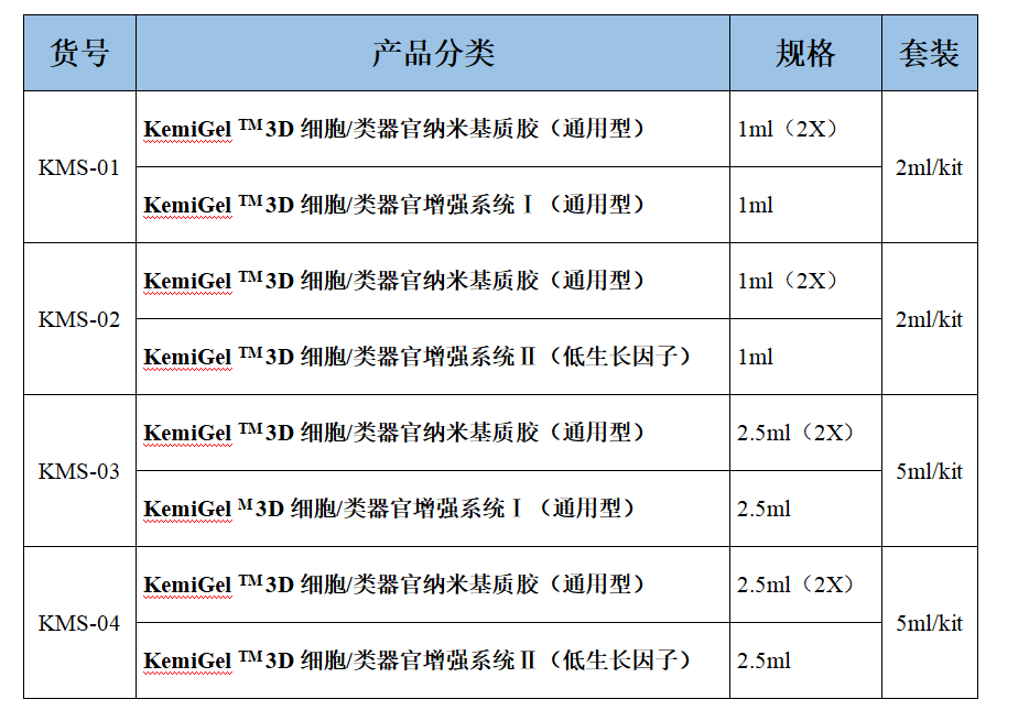 其中KemiGel ?3D細胞/類器官納米基質(zhì)膠套裝包含基質(zhì)膠(KemiGel ?納米基質(zhì)膠)、基質(zhì)膠增強系統(tǒng)(Enhancer I或Enhancer Ⅱ),可應(yīng)用到3D細胞/類器官培養(yǎng)與微環(huán)境構(gòu)建等;用戶可根據(jù)實際需要調(diào)整KemiGel ?納米基質(zhì)膠濃度;本試劑盒操作便利且可調(diào)控基質(zhì)膠硬度進行多種細胞培養(yǎng)測試等, 請操作前詳細閱讀此3D細胞/類器官培養(yǎng)納米基質(zhì)膠應(yīng)用指南。