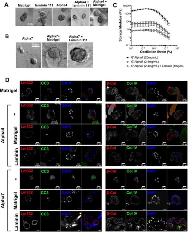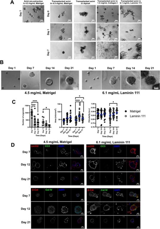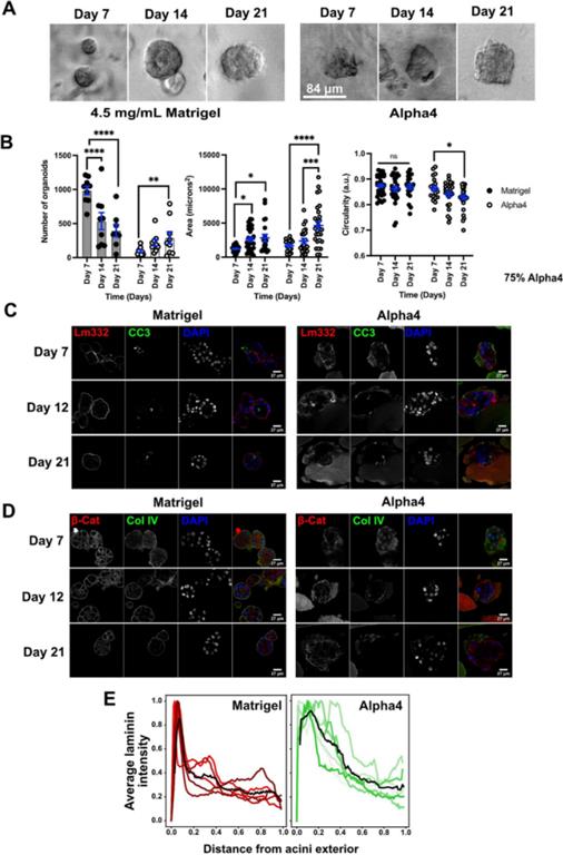 支持MECs的存活,但不支持MCF10A細(xì)胞的小葉極化,將MCF10A細(xì)胞分別封裝在和Matrigel中,21天時(shí)間內(nèi)監(jiān)測(cè)細(xì)胞的存活率、小葉大小和形態(tài)。結(jié)果發(fā)現(xiàn),MCF10A細(xì)胞在中至少存活了21天,并形成了類(lèi)似于Matrigel中的3D小葉結(jié)構(gòu)的聚集物。為了比較在Matrigel和中3D細(xì)胞聚集物的組織結(jié)構(gòu),在第7、12和21天,從Matrigel或中提取完整的細(xì)胞聚集物,并用對(duì)人類(lèi)特異性laminin-alpha 3、膠原IV進(jìn)行免疫染色。在Matrigel中,MCF10A細(xì)胞周?chē)忻鞔_的基底膜,含有人類(lèi)laminin和膠原IV。相比之下,在中,細(xì)胞聚集物缺乏有組織的膠原IV和laminin-332基底膜盡管支持MCF10A的存活,但無(wú)法完全重現(xiàn)Matrigel中觀察到的MCF10A組織結(jié)構(gòu)(圖1)